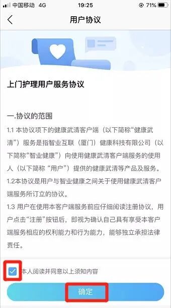 ② 进入APP首页,点击“上门护理”,同意协议内容,点“确定”;